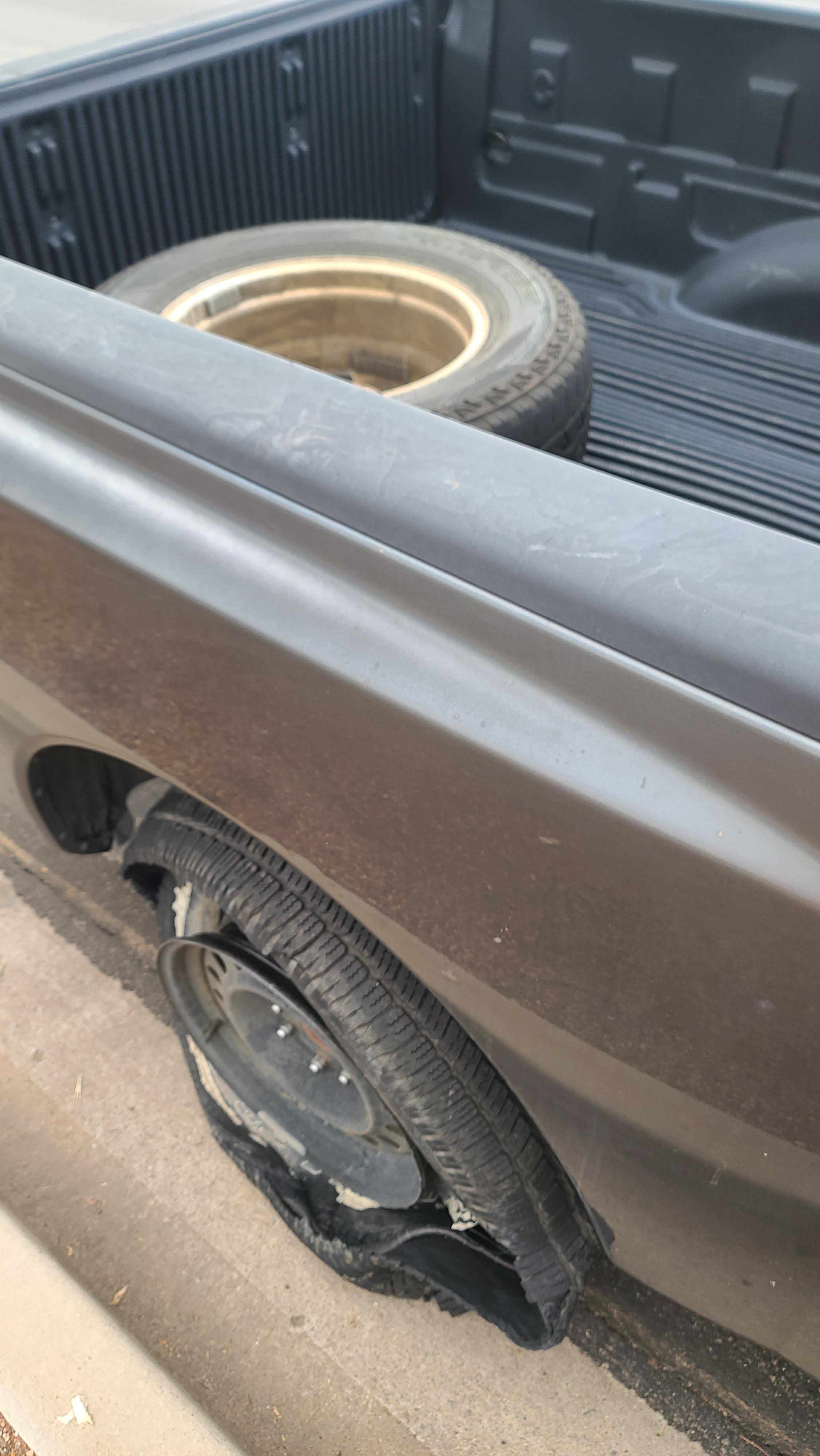Wellthatsucks: Got a flat tire at work. Threw it in the truck bed and put on the spare. About a mile from the tire shop, my spare exploded.