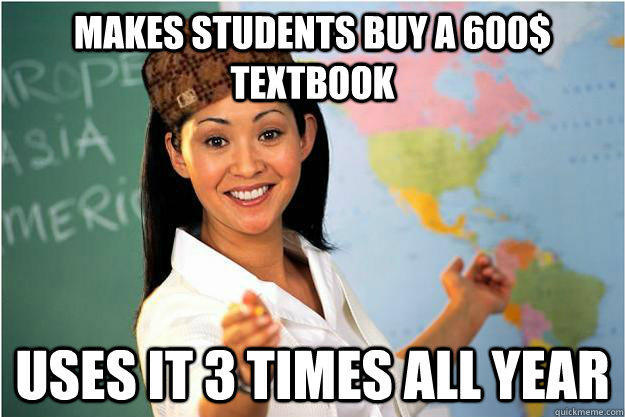 Makes students buy a 600$ textbook uses it 3 times all year